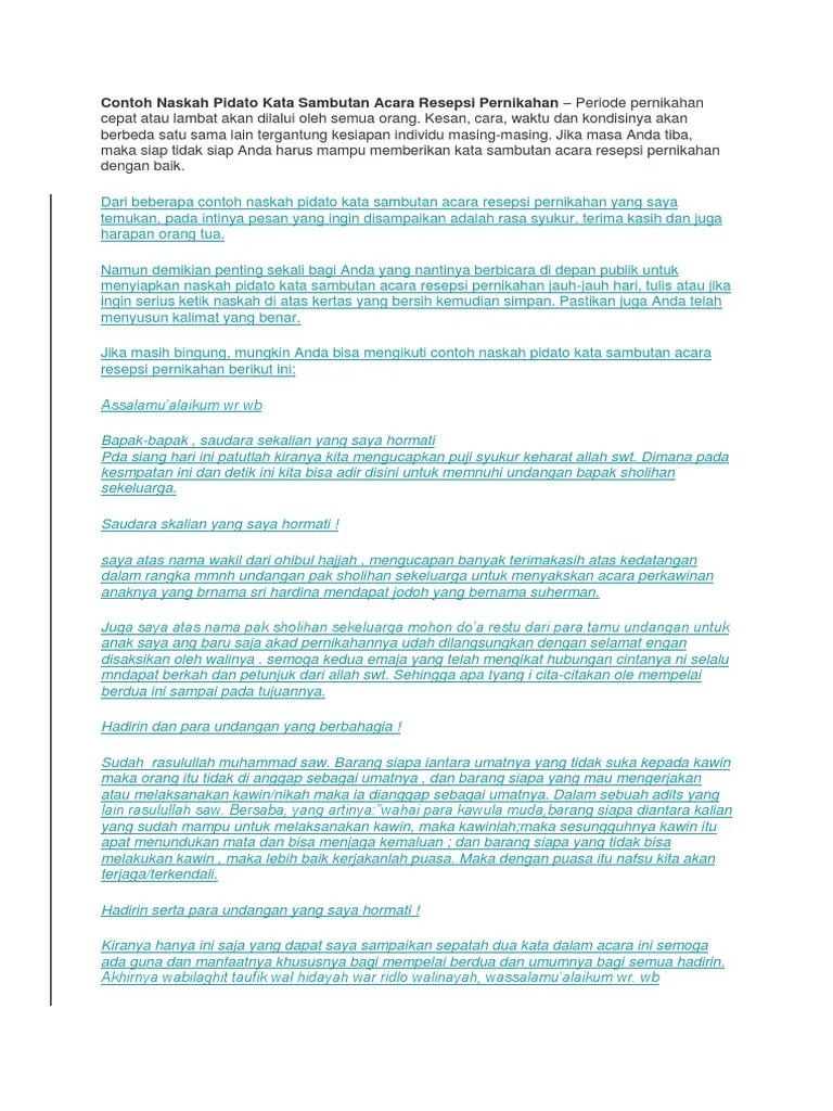 Kata sambutan pernikahan memiliki format yang hampir sama pada setiap acaranya. 'sambutan perwakilan keluarga calon mempelai wanita pada acara akad nikah.' assalamualaikum warahmatullahi wabarakatuh. Contoh teks pidato dalam musibah meninggalnya seseorang. Erizal, mh berikan sambutan sekaligus membuka acara binwin pra nikah usia remaja. Sambutan wakil keluarga dalam resepsi pernikahan katolik. Membuat kata sambutan untuk resepsi pernikahan sangat dibutuhkan untuk menyambut para tamu yang hadir dan juga sebagai bentuk syukur karena . Di hari pernikahan kakak perempuannya, iqbaal memberi sambutan manis yang berhasil membuat hadirin dan siapa saja yang mendengarnya baper. Pada nikah massal 180 pasang calon pengantin. Tanggal 18 januari 2009 di jakarta. Cepat atau lambat akan dilalui oleh semua orang. 0:00 / 12:41•watch full video.